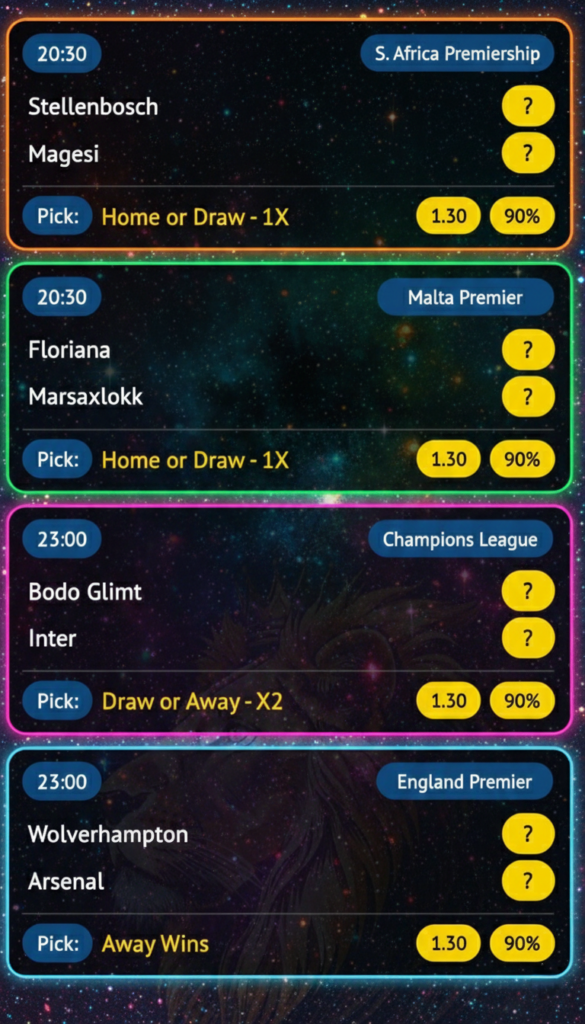 - Low-risk odds: All picks at 1.30 for steady wins.