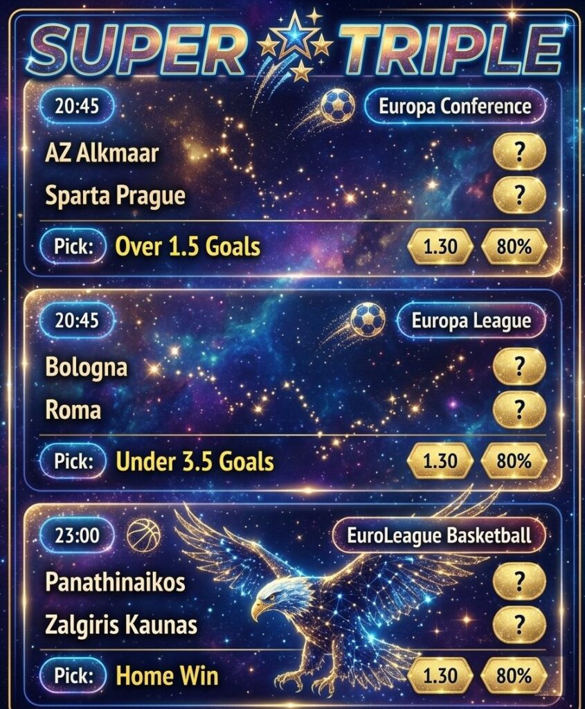 Get ready for an exciting evening of European action with our Super Triple selections! These picks feature strong value bets from the Europa Conference League, Europa League, and EuroLeague Basketball. All picks come with solid odds around 1.30 and an estimated 80% confidence based on form, stats, and trends. 🚀